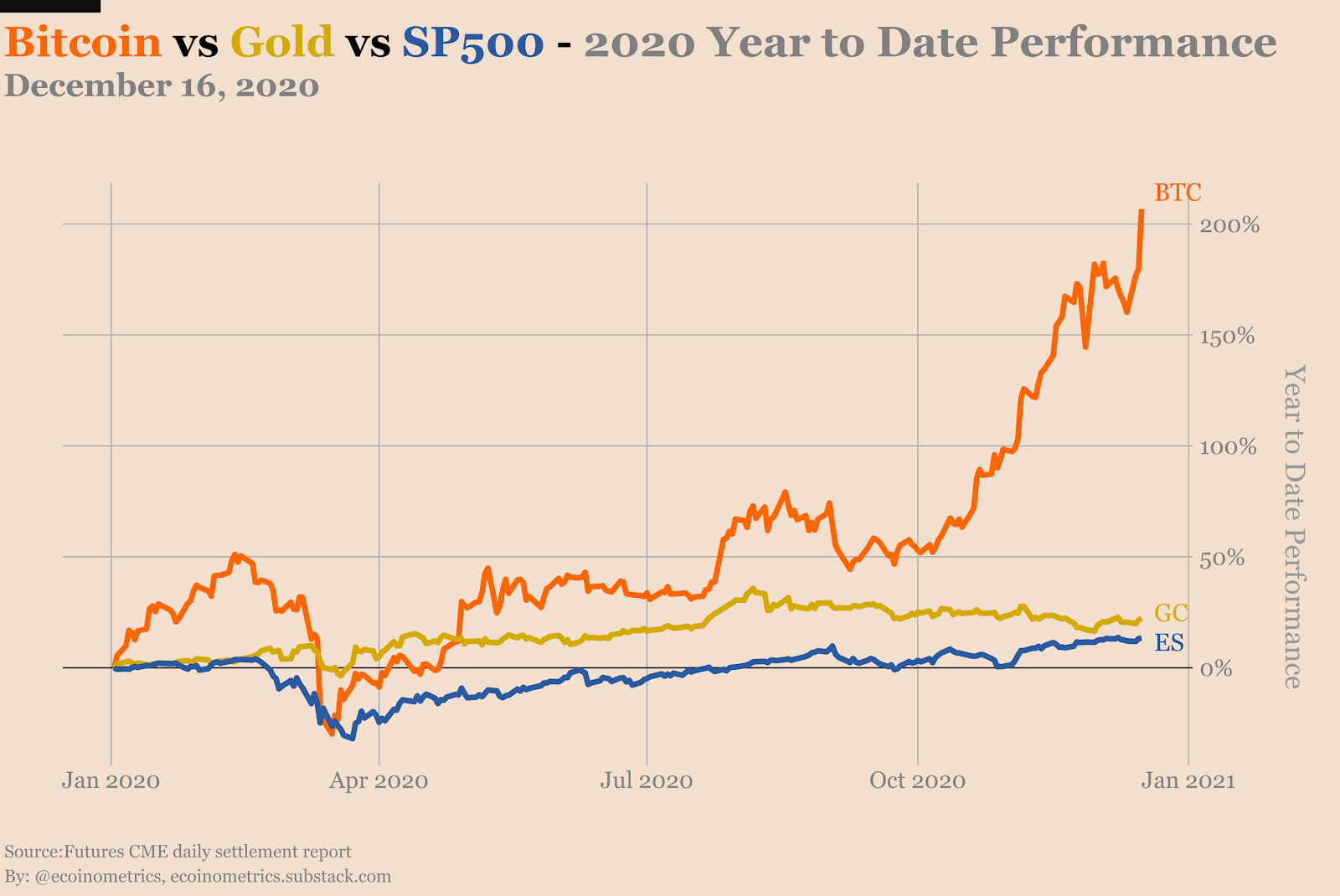 Bitcoin (cam), vàng (vàng) và S&P 500 (xanh) năm 2020 (tính đến ngày 16/12) | Nguồn: Futures CME