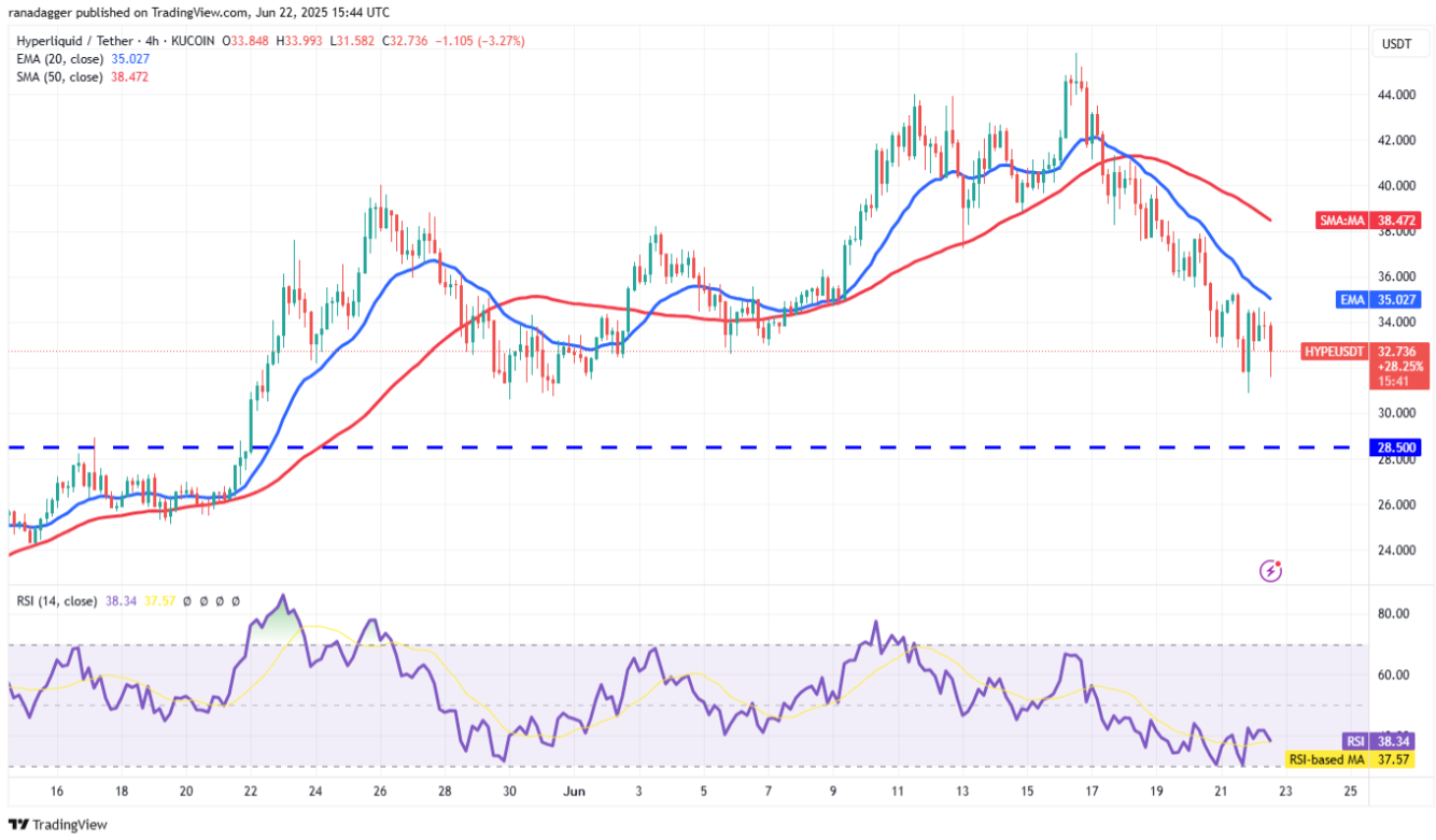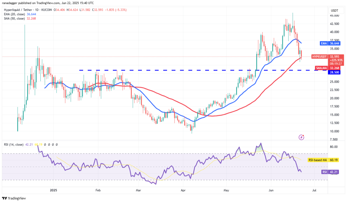 Vào ngày thứ Bảy, phe bò đã nỗ lực bảo vệ đường SMA 50 ngày (ở mức $32,26), nhưng cú bật lên sau đó đã nhanh chóng bị bán tháo. Điều này làm tăng khả năng HYPE/USDT sẽ phá vỡ đường SMA 50 và lao dốc về vùng đột phá trước đó ở $28,50.