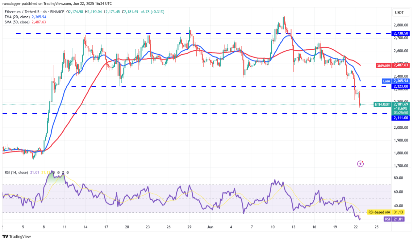 Áp lực bán tiếp tục gia tăng trong ngày thứ Bảy, khiến cặp ETH/USDT phá vỡ ngưỡng hỗ trợ $2.323. Dù phe bò cố gắng đưa giá trở lại trên mốc hỗ trợ đã bị phá vỡ, nhưng lực bán được kích hoạt đã kéo giá về sát vùng hỗ trợ $2.111. Phe bò sẽ phải bảo vệ mốc $2.111 bằng mọi giá, bởi nếu thất bại, cặp tiền có thể rơi sâu về mức $1.754.
