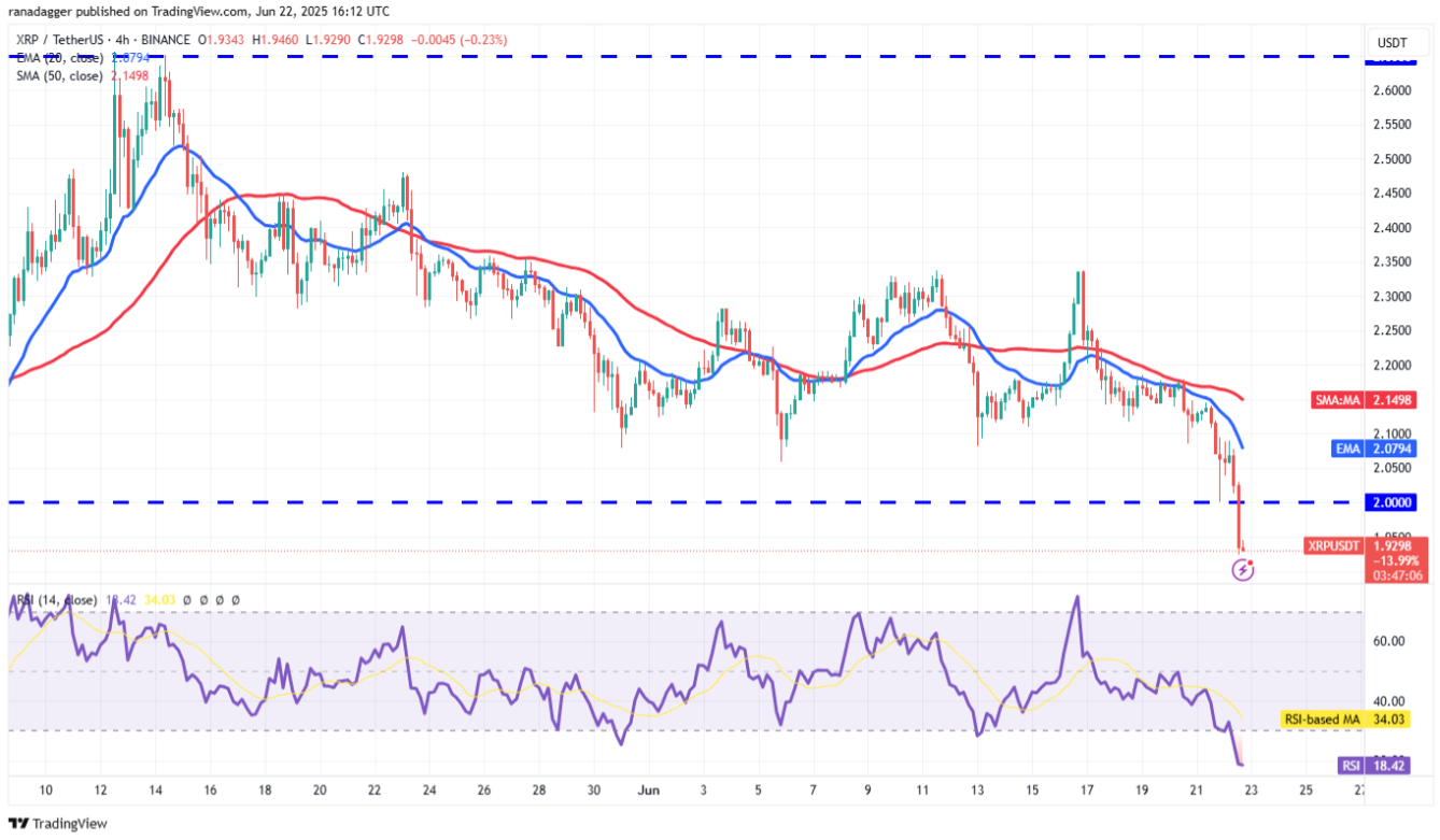 Dù phe bò đã cố gắng tạo cú bật lên từ vùng hỗ trợ $2, nhưng phe gấu nhanh chóng nhấn chìm đà phục hồi khi giá chạm vào đường EMA 20 trên biểu đồ 4 giờ. Giá quay đầu giảm và tiếp tục phá vỡ mốc $2, kéo RSI vào vùng quá bán – cho thấy khả năng xảy ra một đợt phục hồi ngắn hạn là khá cao.