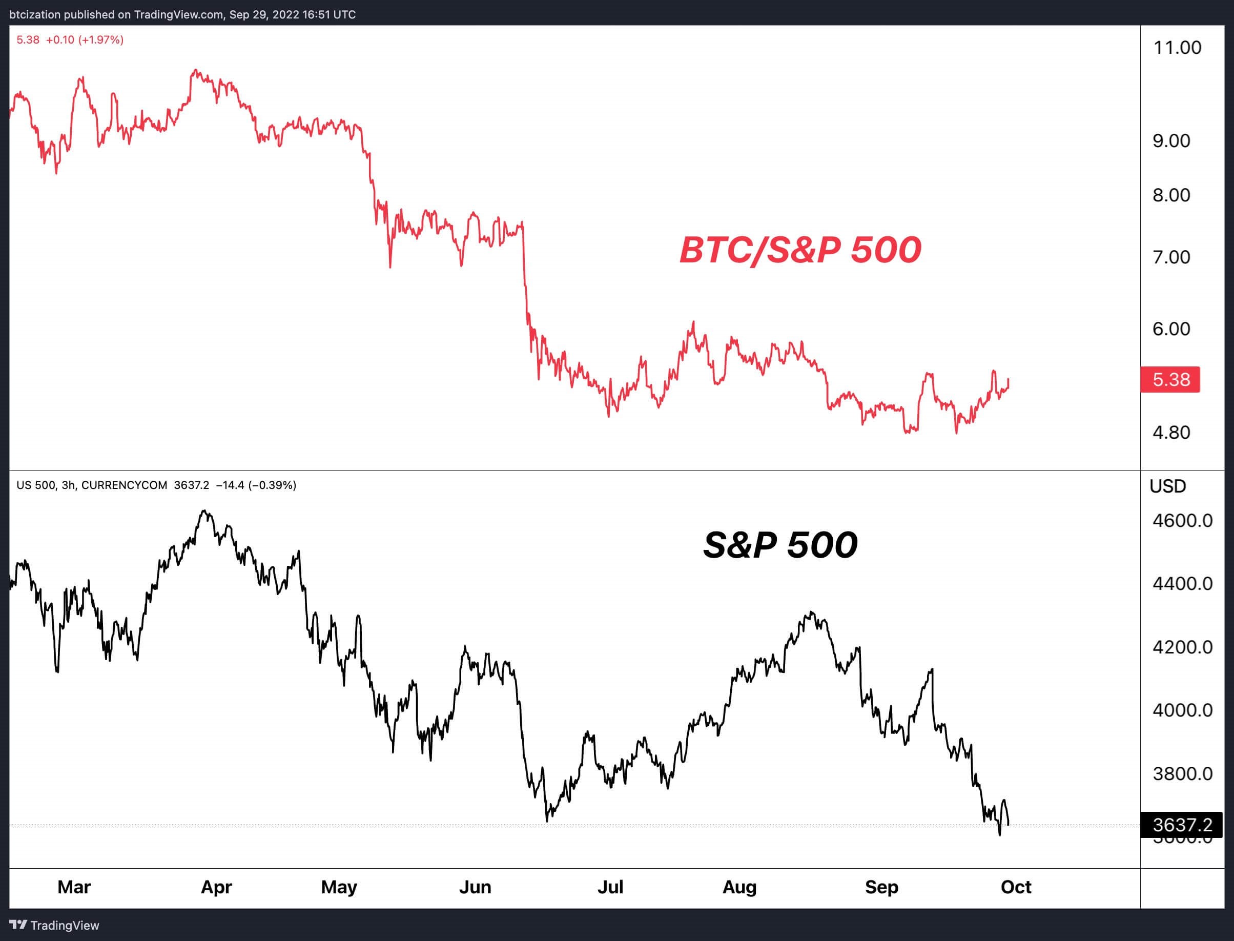 Biểu đồ dưới đây của anh cho thấy cả hai di chuyển theo hướng lệch xa nhau khi S&P 500 tiếp tục trượt dốc trong bối cảnh suy yếu vĩ mô. Bằng chứng là Bank of England (BoE) chuyển sang nới lỏng định lượng trong tuần này.
