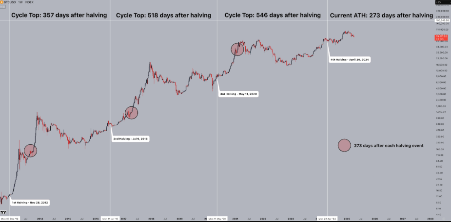 Bitcoin đã đạt mức ATH mới trên $109.000 vào ngày 20 tháng 1, 273 ngày sau sự kiện halving Bitcoin 2024, báo hiệu chu kỳ thị trường tăng tốc.