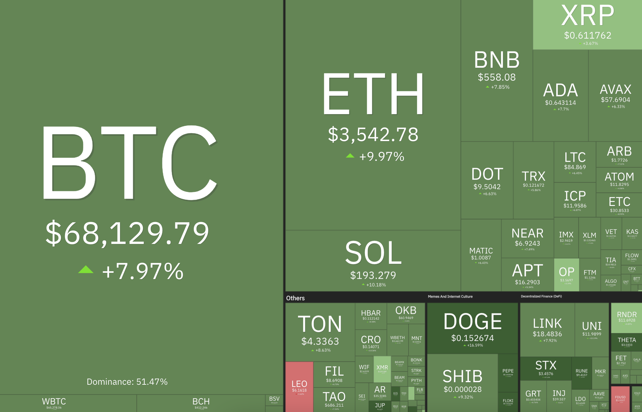 Bitcoin đã tăng khoảng 8% sau tin tức và đang giao dịch ở mức 68.129 USD vào thời điểm báo chí, sau khi giảm xuống mức thấp 60.800 USD trước đó trong ngày.