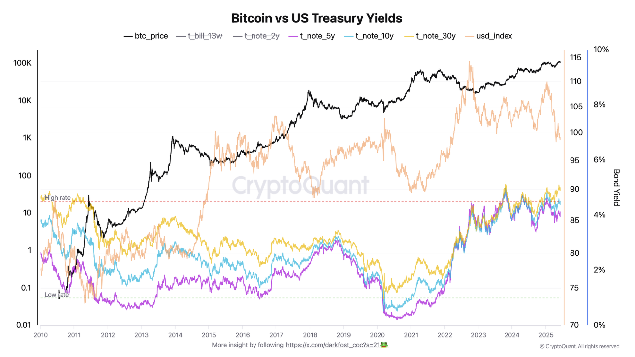 Theo dữ liệu từ CryptoQuant, Bitcoin đang cho thấy dấu hiệu tách rời khỏi các yếu tố vĩ mô truyền thống. Dù lợi suất trái phiếu Mỹ (5 năm, 10 năm, 30 năm) đang ở mức cao trong lịch sử và chỉ số DXY (US Dollar Index) biến động mạnh – các yếu tố thường khiến tài sản rủi ro như crypto điều chỉnh – giá BTC vẫn tiếp tục xu hướng tăng.
