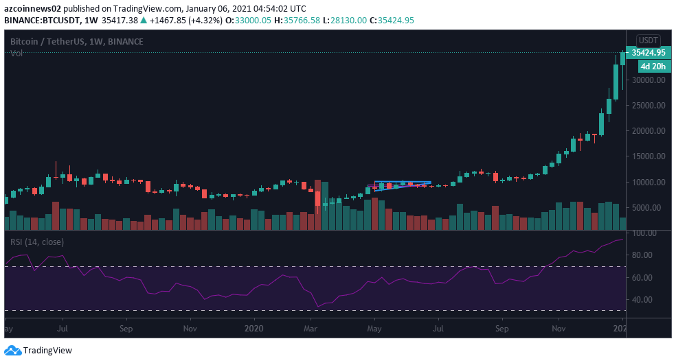 Bitcoin đã thiết lập mức cao nhất mọi thời đại mới là $ 35,790 cách đây ít phút và đang giao dịch ở 35,400 đô tại thời điểm viết bài.
