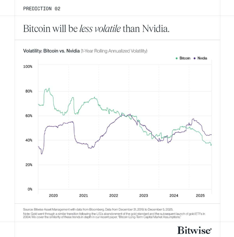 Đáng chú ý, Bitcoin cũng đang cho thấy dấu hiệu “trưởng thành” rõ rệt khi mức độ biến động trong năm 2025 thậm chí thấp hơn cả những cổ phiếu công nghệ vốn được xem là trụ cột như Nvidia (NVIDIA). Đây là tín hiệu cho thấy BTC đang dần dịch chuyển từ một tài sản đầu cơ thuần túy sang vai trò của một tài sản tài chính ổn định hơn.
