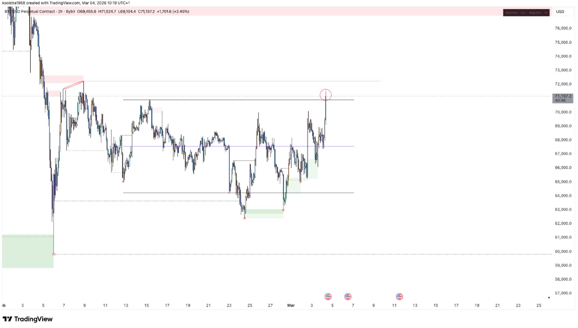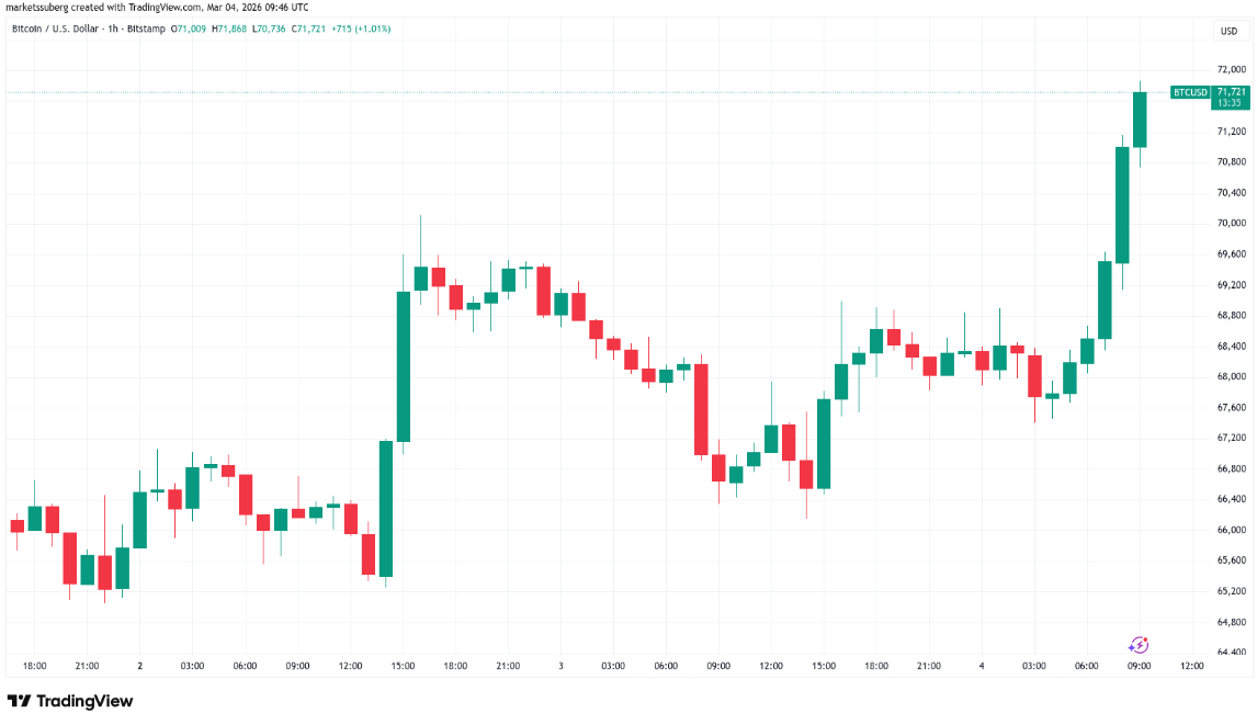 Bitcoin (BTC) đã tăng tốc mạnh mẽ, vượt mốc 71.000 USD trong phiên giao dịch ngày thứ Tư, khi những căng thẳng địa chính trị leo thang tiếp tục khuấy đảo thị trường tài chính toàn cầu. Đà tăng ấn tượng này diễn ra trong bối cảnh tâm lý nhà đầu tư dao động mạnh, góp phần đẩy biên độ biến động của thị trường lên mức cao.