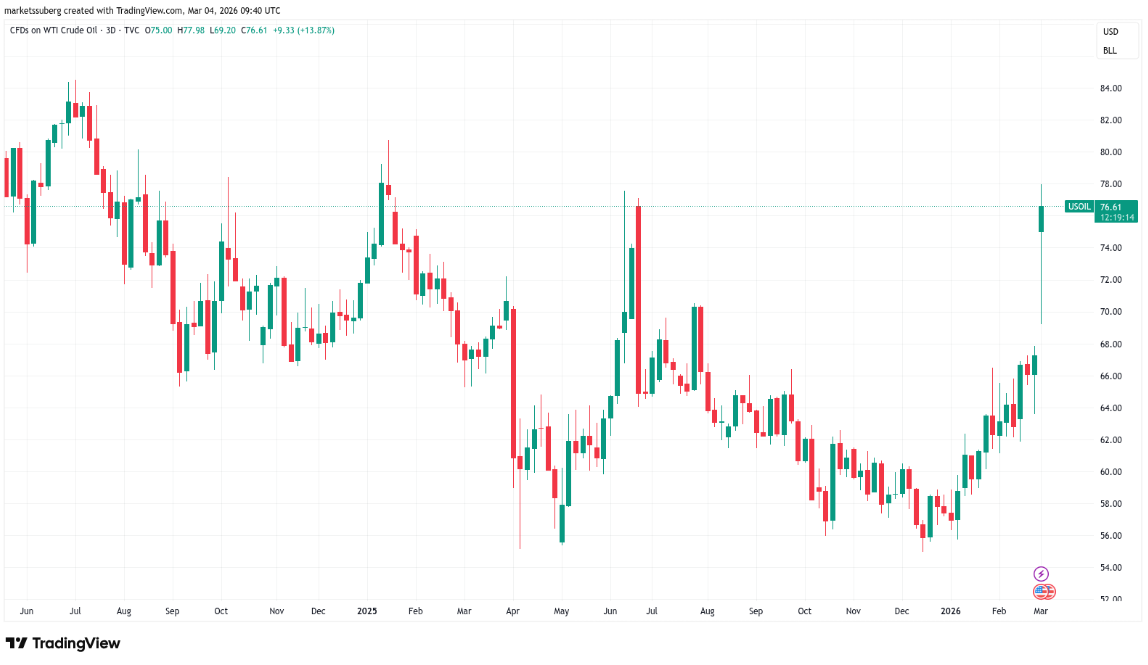 Giao dịch CFD trên biểu đồ ba ngày của giá dầu WTI | Nguồn: TradingView