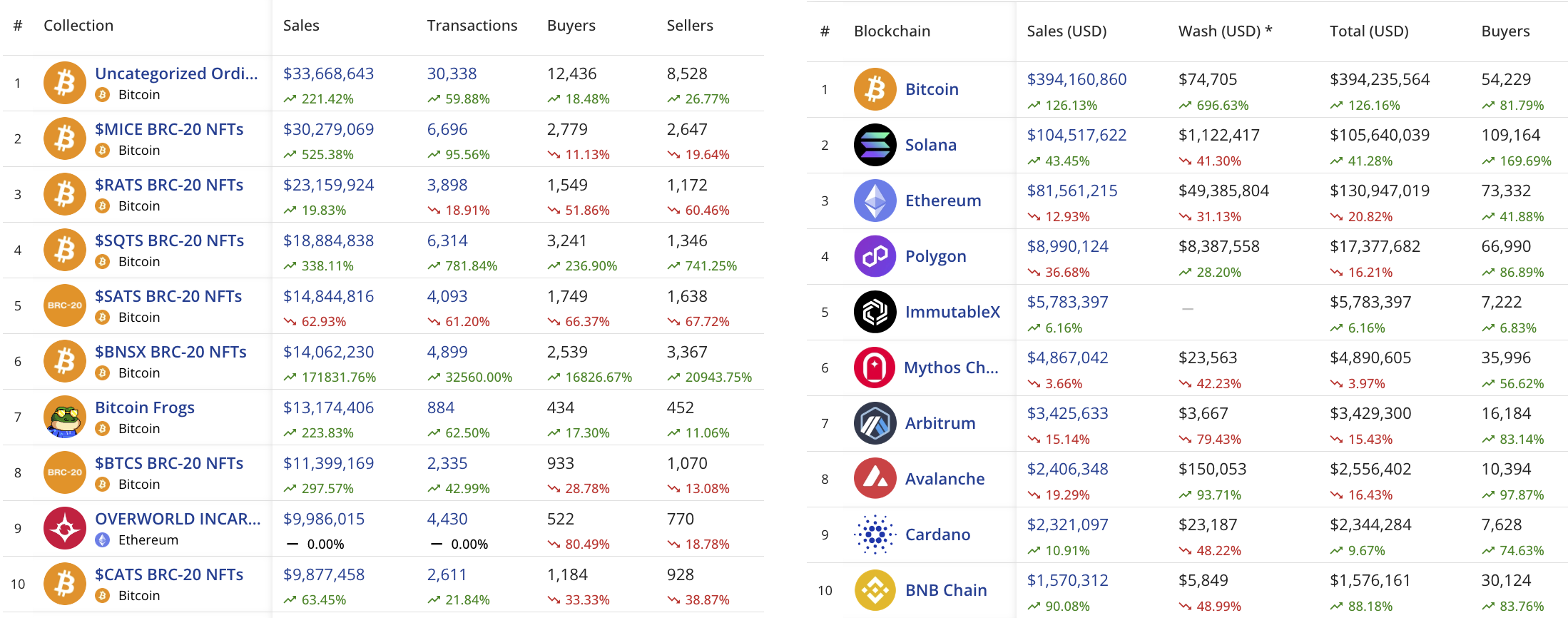Dữ liệu từ cryptoslam.io trong tuần này tiết lộ rằng Bitcoin đã đạt được doanh số NFT 394,1 triệu USD, vượt qua Solana ở vị trí thứ hai, vốn ghi nhận 104,5 triệu USD trong bảy ngày. Ethereum, trước đây dẫn đầu về doanh số NFT, hiện đứng thứ ba với doanh thu khoảng 81,5 triệu USD trong khoảng thời gian 7 ngày.
