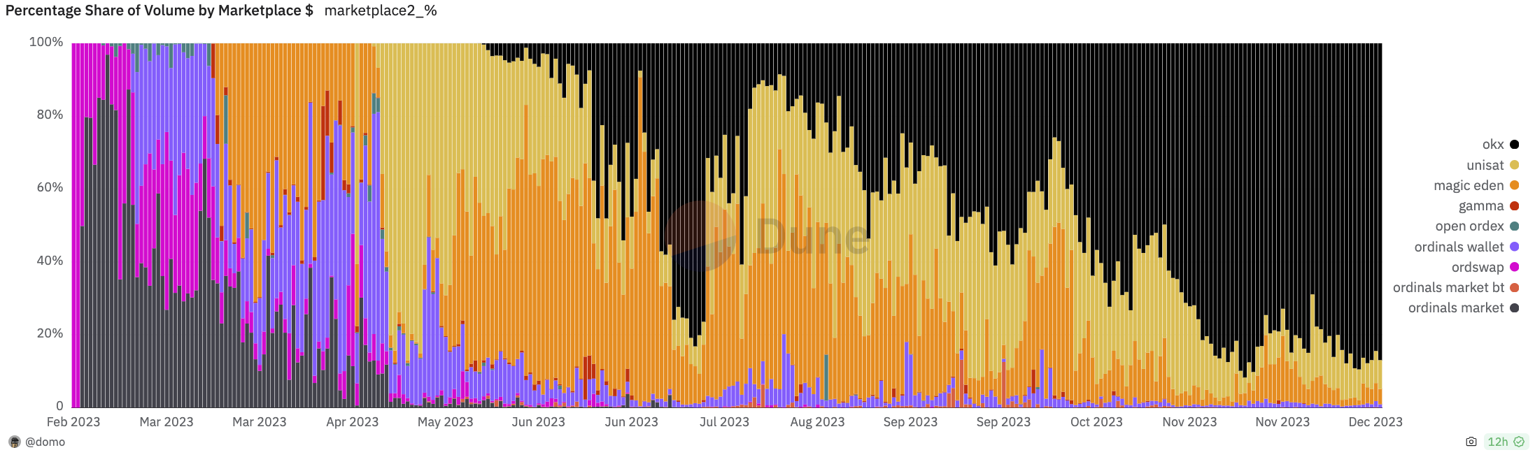 Hiện tại, bộ ba thị trường hàng đầu về doanh số NFT dựa trên Bitcoin bao gồm Okx, Unisat và Magic Eden. Tính đến ngày 20 tháng 12 năm 2023, Okx đang dẫn đầu, nắm giữ hơn 85% thị phần trong phân khúc này.