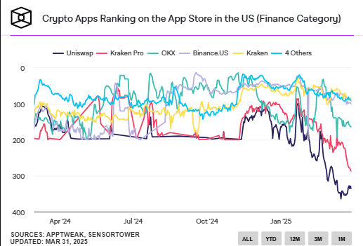 Xếp hạng của Uniswap trong danh mục tài chính trên App Store tại Hoa Kỳ đã chứng kiến ​​sự sụt giảm mạnh, lao dốc từ thứ hạng 99 xuống 364 chỉ trong vòng hai tháng qua.