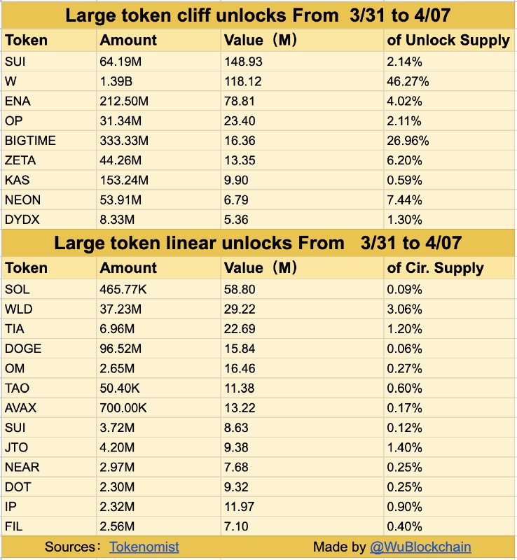 Theo Tokenomist, trong 7 ngày tới, sẽ có các đợt mở khóa token lớn (với lượng mở khóa vượt 5 triệu USD) cho các token như SUI, W, ENA, OP, BIGTIME, ZETA, KAS, NEON và DYDX.