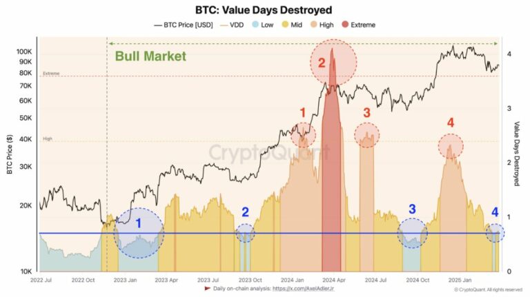 Xu hướng này được thể hiện rõ trong dữ liệu on-chain mới nhất, đặc biệt là số liệu Value Days Destroyed (VDD), hiện đã đạt đến giai đoạn có thể thúc đẩy các đợt tăng giá trong tương lai.