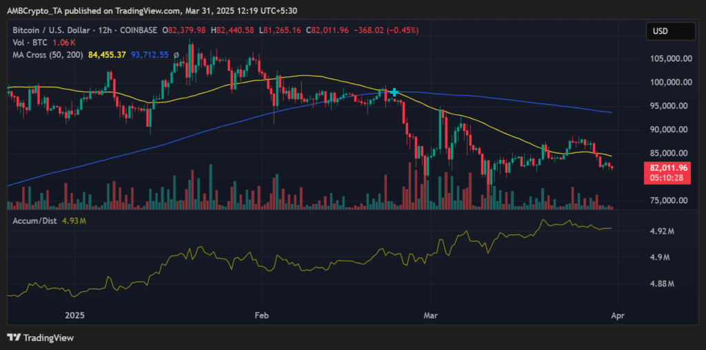 Bitcoin hiện đang được giao dịch quanh $82.100, thấp hơn cả Đường trung bình động 50 ngày và 200 ngày lần lượt tại $84.455 và $93.712.