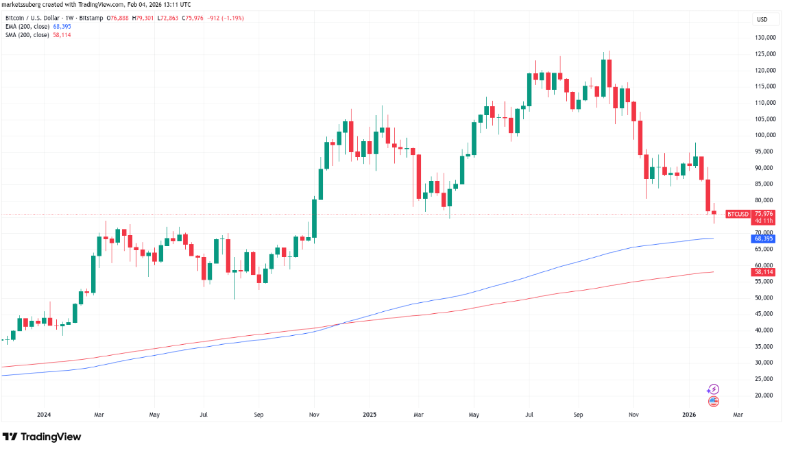 Các phân tích đang ngày càng nghiêng về kịch bản Bitcoin sẽ quay lại kiểm tra đường trung bình động hàm mũ (EMA) 200 tuần, hiện nằm quanh mốc 68.400 USD.