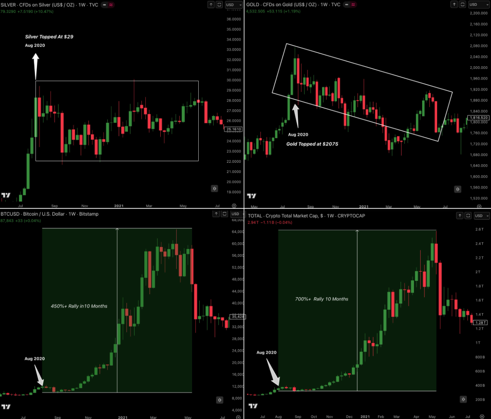 Biểu đồ hàng tuần của BTC/USD, tổng vốn hóa thị trường tiền điện tử, XAU/USD và XAG/USD | Nguồn: TradingView/Bull Theory