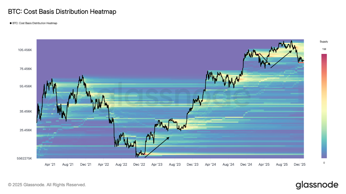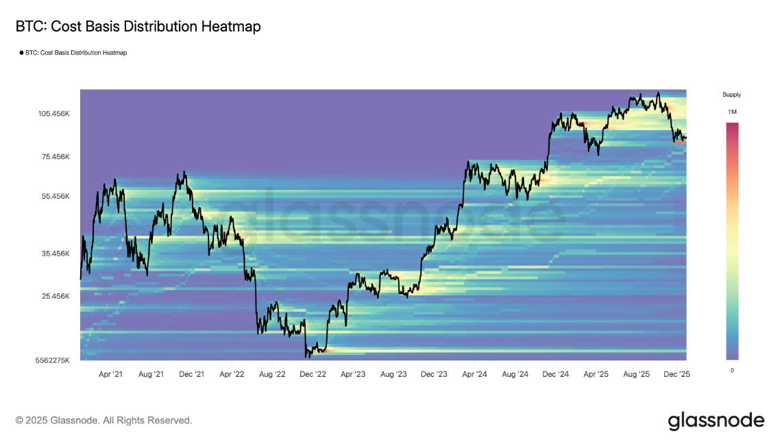 Biểu đồ then chốt tiếp theo cần đặc biệt theo dõi trong năm 2026 là bản đồ nhiệt Phân phối Cơ sở Chi phí (Cost Basis Distribution – CBD) của Bitcoin. Công cụ này phản ánh cách nguồn cung BTC được tích lũy tại các vùng giá khác nhau, qua đó hé lộ “dấu chân” của dòng tiền trên thị trường.