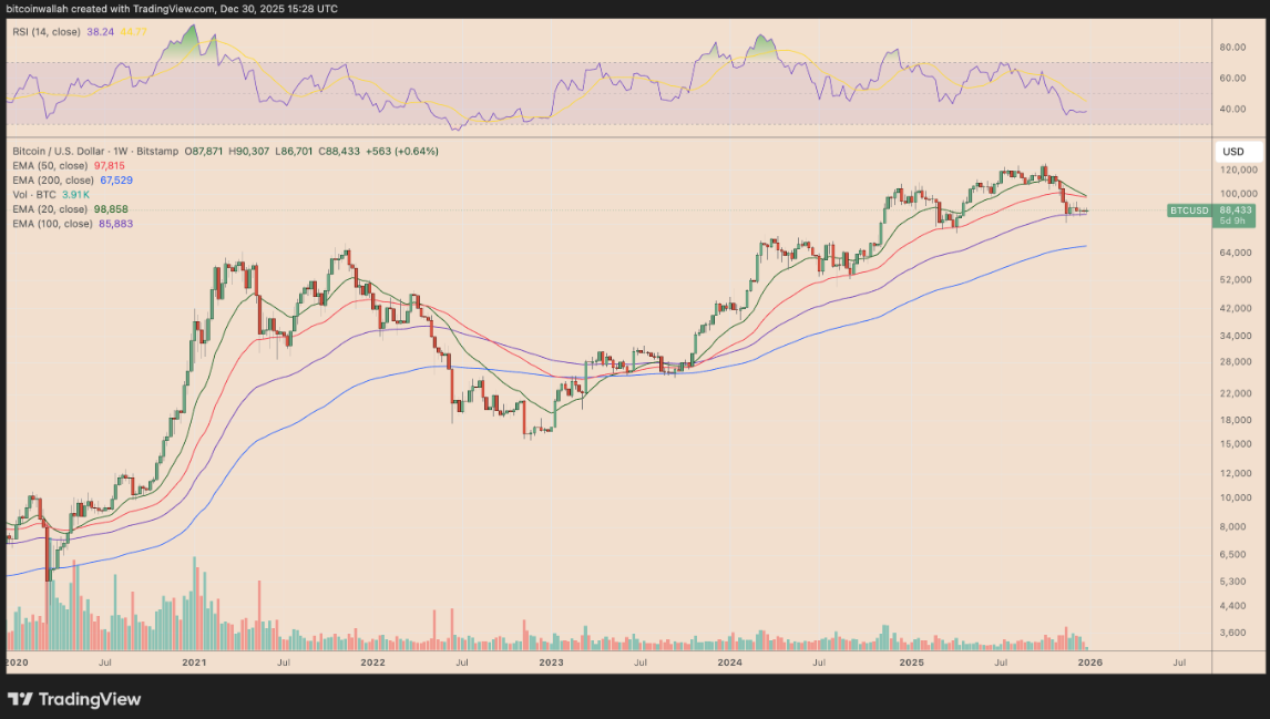 Biểu đồ tuần của Bitcoin đang hé lộ lý do vì sao giai đoạn đi ngang có phần “nhàm chán” hiện tại lại mang ý nghĩa then chốt khi thị trường chuẩn bị bước sang năm 2026.