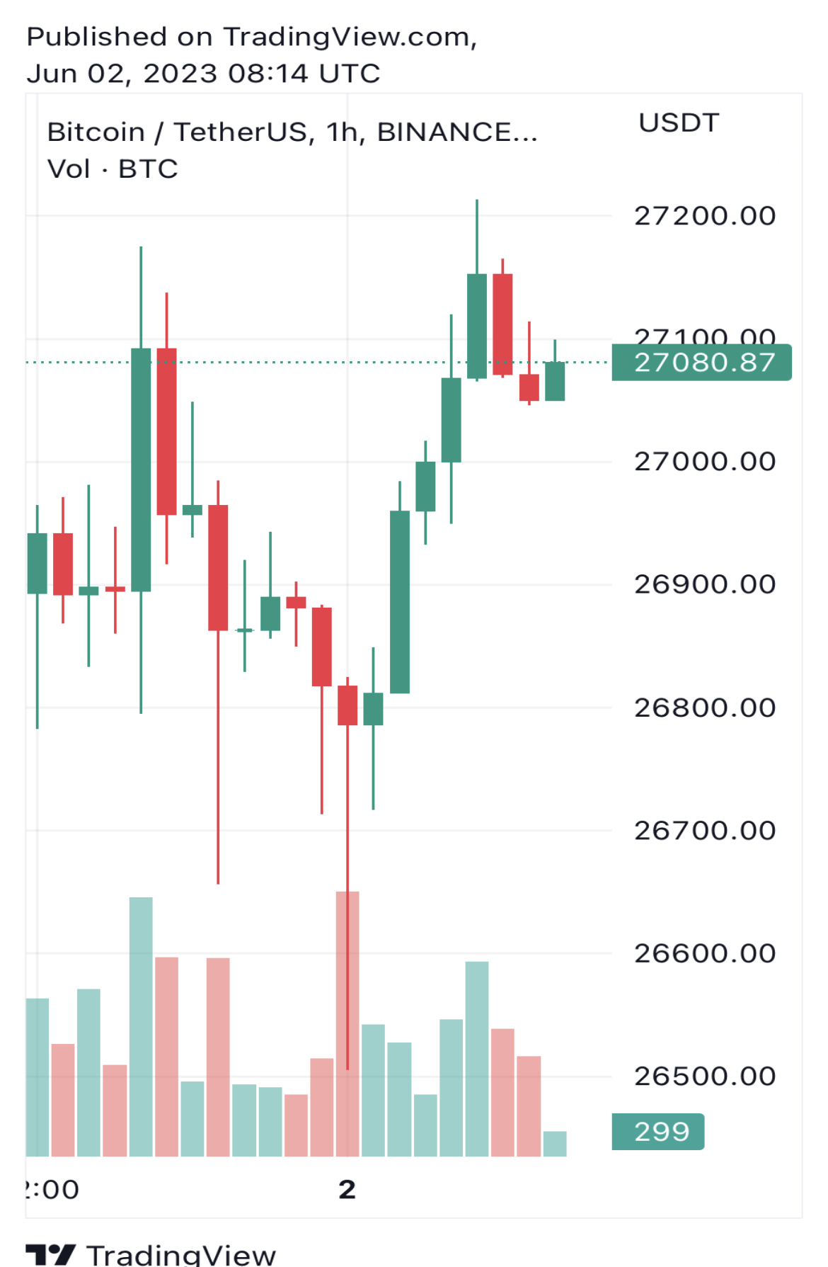 Trong khi đó, Bitcoin tăng nhẹ 1% trong ngày và đang gió dịch ở mức 27.080 đô la sau khi leo lên mức cao trên 27.200 đô la.
