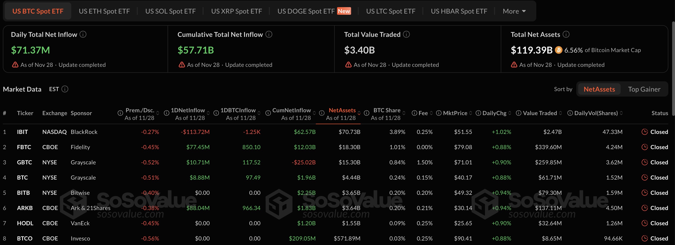 Vào thứ Sáu, các ETF Bitcoin giao ngay tại Mỹ ghi nhận dòng tiền ròng 71,4 triệu USD, dẫn đầu là ARKB của Ark & 21Shares với 88 triệu USD. FBTC của Fidelity thêm 77,5 triệu USD, trong khi các sản phẩm của Grayscale (GBTC và BTC) đóng góp lần lượt 10,7 triệu USD và 8,9 triệu USD.