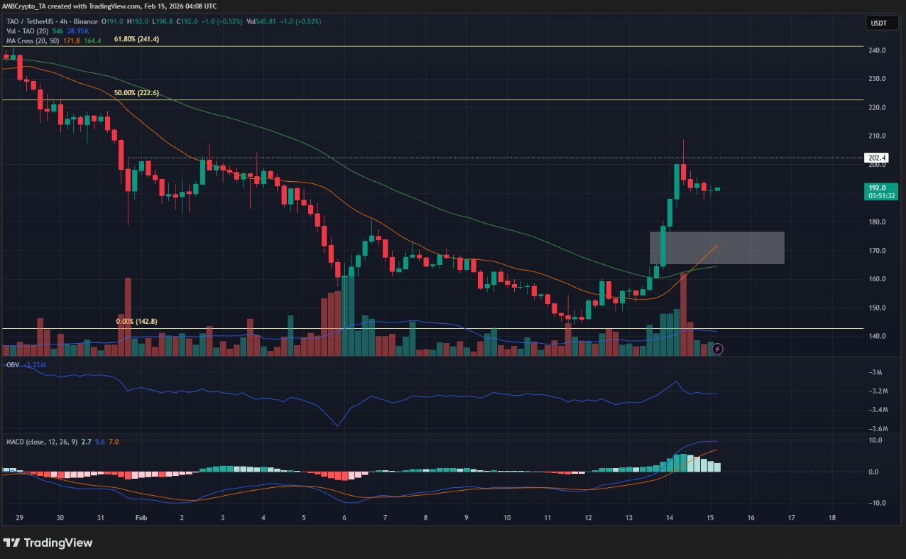 Trong kịch bản tích cực, đà phục hồi hiện tại của TAO có thể mở rộng và vượt qua vùng cung cục bộ quanh mốc 200 USD. Khi đó, các mức Fibonacci thoái lui tại 241,4 USD và 268,2 USD sẽ đóng vai trò là những mục tiêu tăng giá tiềm năng trong ngắn hạn.