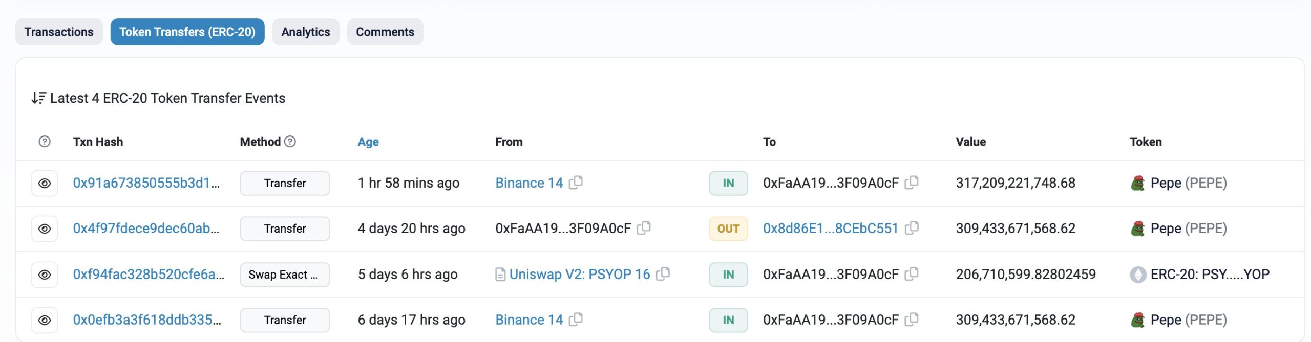 Theo dữ liệu được chia sẻ, một địa chỉ ví của BlackRock Fund đã rút tổng cộng 1,27 nghìn tỷ PEPE trị giá khoảng 1,98 triệu đô la từ Binance đến 4 địa chỉ vào thứ 5.