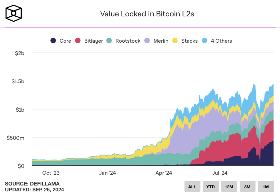 TVL của Core đã tăng mạnh từ gần mức 0 vào đầu năm 2024, hiện vượt qua các giải pháp Bitcoin L2 khác như Rootstock và Bitlayer. Xu hướng này cho thấy sự quan tâm gia tăng đối với các giải pháp mở rộng quy mô Bitcoin, có thể được thúc đẩy bởi nhu cầu về giao dịch hiệu quả và tiết kiệm chi phí hơn.