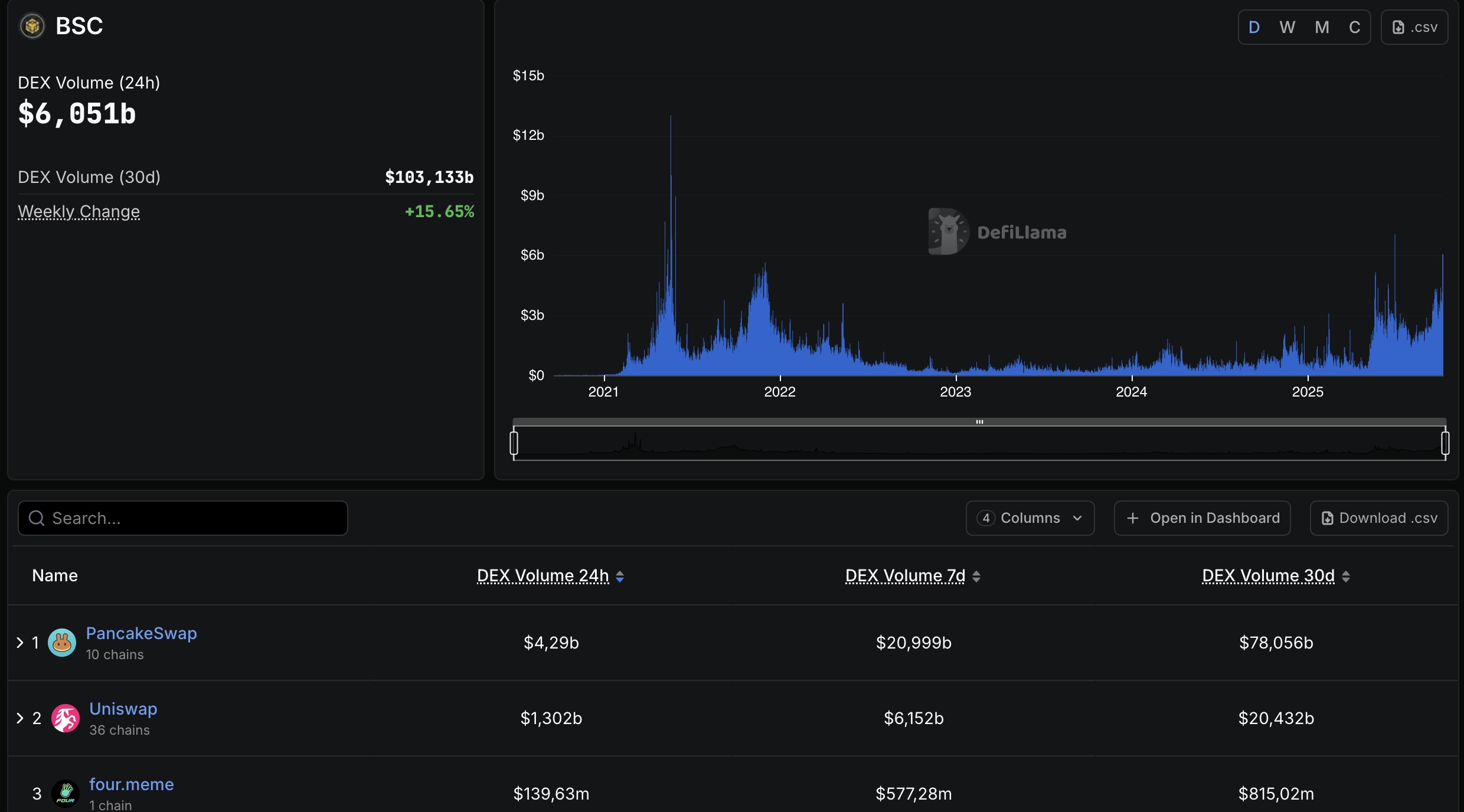 Theo dữ liệu từ DeFiLlama, khối lượng giao dịch trên các sàn phi tập trung (DEX) thuộc hệ sinh thái BNB Chain đã đạt 6,051 tỷ USD vào ngày 7/10, đánh dấu mức cao thứ hai trong năm 2025. Sự bùng nổ này được thúc đẩy mạnh mẽ bởi làn sóng giao dịch memecoin on-chain đang lan rộng trên mạng lưới.