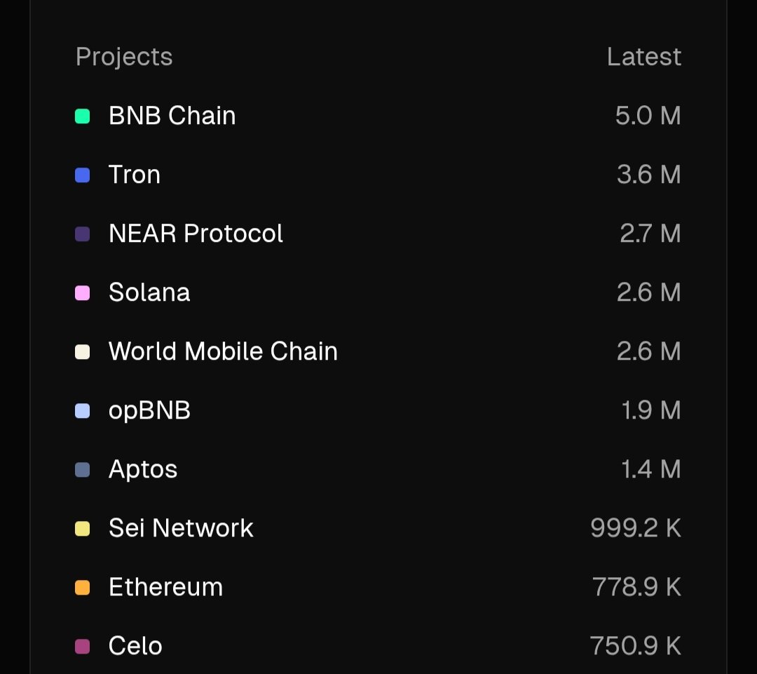 Dữ liệu từ bảng điều khiển của Artemis cho thấy BNB Chain đã đạt mốc khoảng 5 triệu người dùng hoạt động hàng ngày vào tháng 2/2026, dẫn đầu so với Tron và Solana. Các nguồn phân tích blockchain ghi nhận mức tăng khoảng 10% so với tháng trước.
