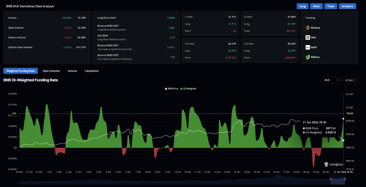 Dữ liệu từ CoinGlass cho thấy hợp đồng mở của BNB đã giảm 5,25%, xuống còn 1,39 tỷ USD trong vòng 24 giờ, phản ánh xu hướng thu hẹp quy mô các hợp đồng tương lai khi trader đồng loạt đóng vị thế hoặc giảm đòn bẩy để hạn chế rủi ro.