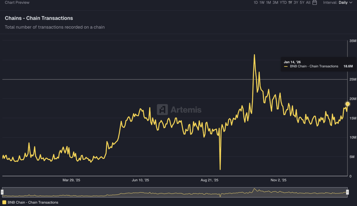 Song song đó, dữ liệu từ Artemis Analytics cho thấy số lượng giao dịch trên mạng lưới đã vọt lên 18,6 triệu vào thứ Tư, xác nhận sự trở lại của lực cầu và mức độ tham gia của người dùng. Đà tăng trưởng mạng lưới bền bỉ này được kỳ vọng sẽ tiếp tục đóng vai trò là yếu tố hỗ trợ quan trọng cho nhu cầu đối với token gốc BNB.