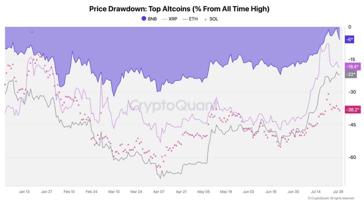 Trong khi phần lớn các đồng tiền điện tử lớn như BTC, ETH hay SOL trải qua đợt điều chỉnh mạnh với mức giảm 60–80% từ đỉnh, BNB lại thể hiện sức mạnh ổn định hiếm thấy khi chỉ giảm tối đa 30% trong chu kỳ này. Không chỉ trụ vững, BNB hiện đang dần phục hồi và tiến sát mức đỉnh lịch sử, cho thấy dòng tiền và niềm tin của nhà đầu tư vẫn kiên định với hệ sinh thái Binance.