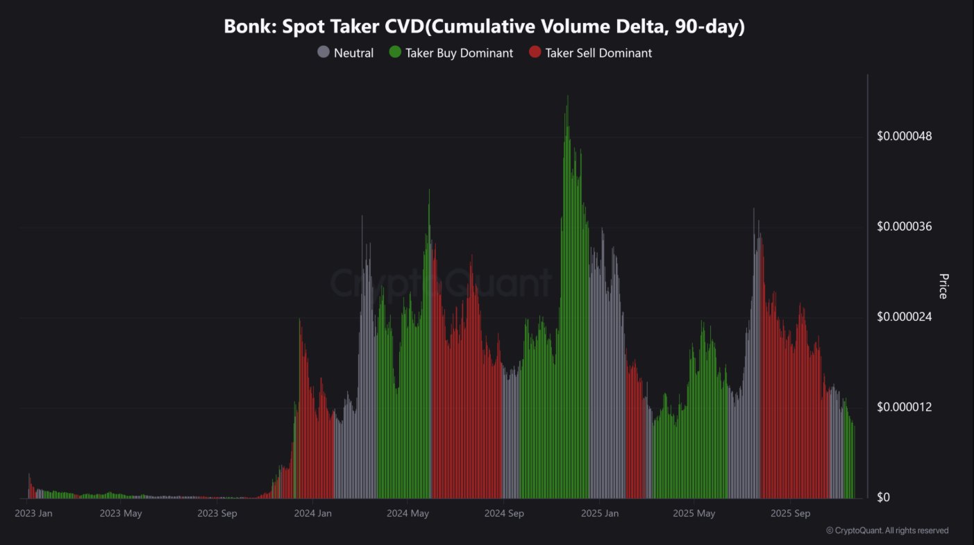 Đáng chú ý, dữ liệu cũng cho thấy lực mua của cá voi tăng lên khi chỉ số Spot Taker CVD (trong 90 ngày gần nhất) đảo chiều sang xu hướng tăng tại thời điểm viết bài. Sự chuyển dịch này bắt đầu từ ngày 8/11 – trùng khớp với thời điểm hiệu ứng từ BONK ETP có thể đã bắt đầu phát huy tác động lên thị trường.