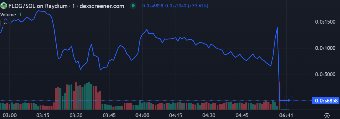 Biến động giá của FLOG trên Raydium phản ánh biến động giá của các dự án bị kéo theo mà Flip Research quan sát được | Nguồn: Dexscreener