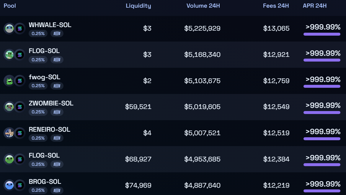 Nhiều pool thanh khoản trên Raydium có rất ít hoặc không có thanh khoản nhưng lại tạo ra khối lượng giao dịch không thực. Ví dụ, pool FLOG-SOL chỉ có 3 USD thanh khoản nhưng có hơn 5 triệu USD khối lượng giao dịch trong 24 giờ.