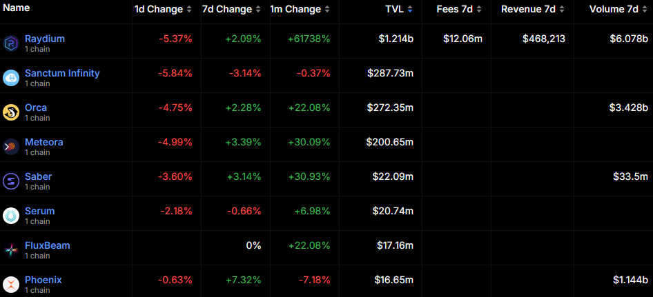 Trong bảy ngày tính đến ngày 30 tháng 7, Raydium dẫn đầu khối lượng giao dịch DEX của Solana với 6,078 tỷ USD. Orca và Phoenix lần lượt theo sau với 3,428 tỷ USD và 1,144 tỷ USD.