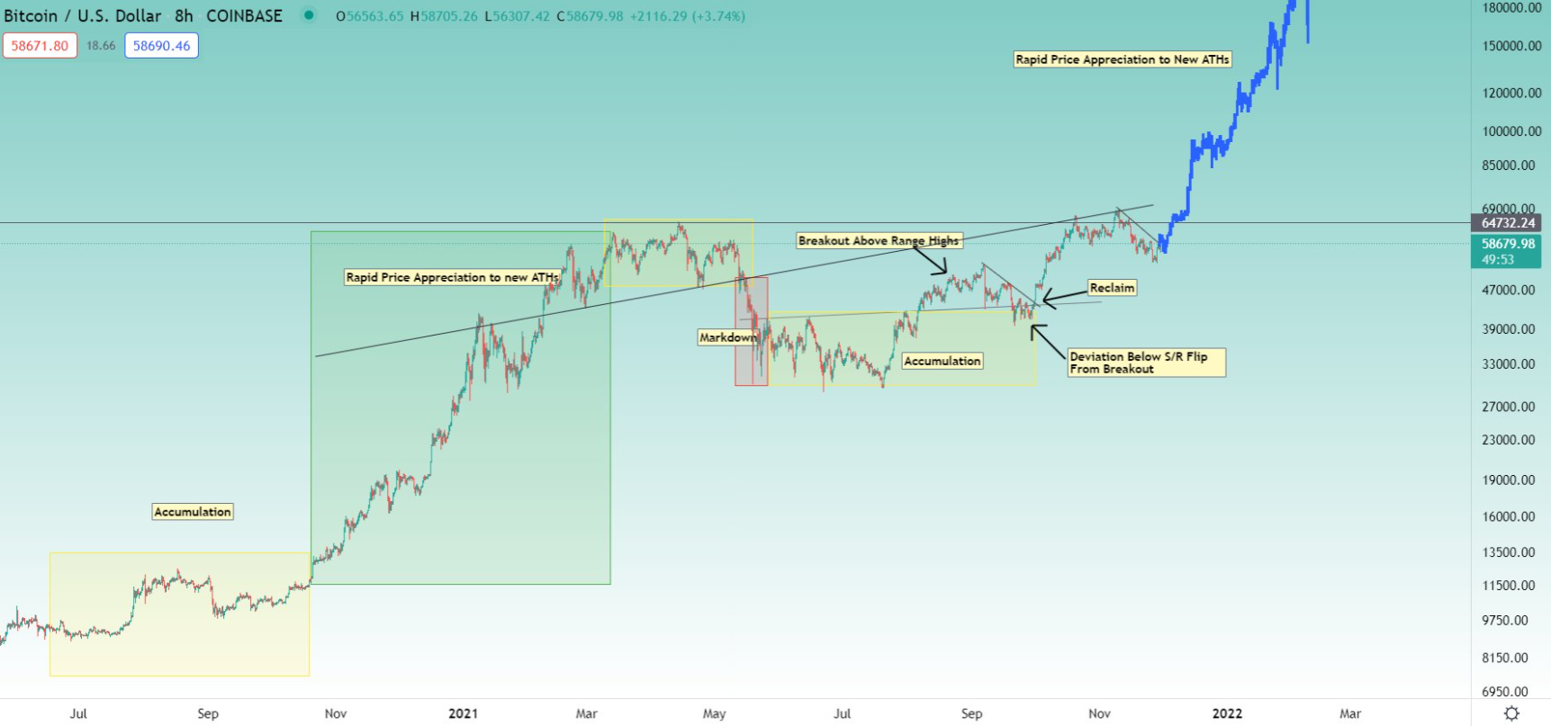 Người được biết đến trong ngành với biệt danh Kaleo nói với 449.800 người theo dõi trên Twitter của mình rằng hành động giá của BTC trong những tháng gần đây đang phản ánh năm 2020, trong đó giai đoạn tích lũy được theo sau bởi sự tăng giá nhanh chóng lên mức cao nhất mọi thời đại mới.
