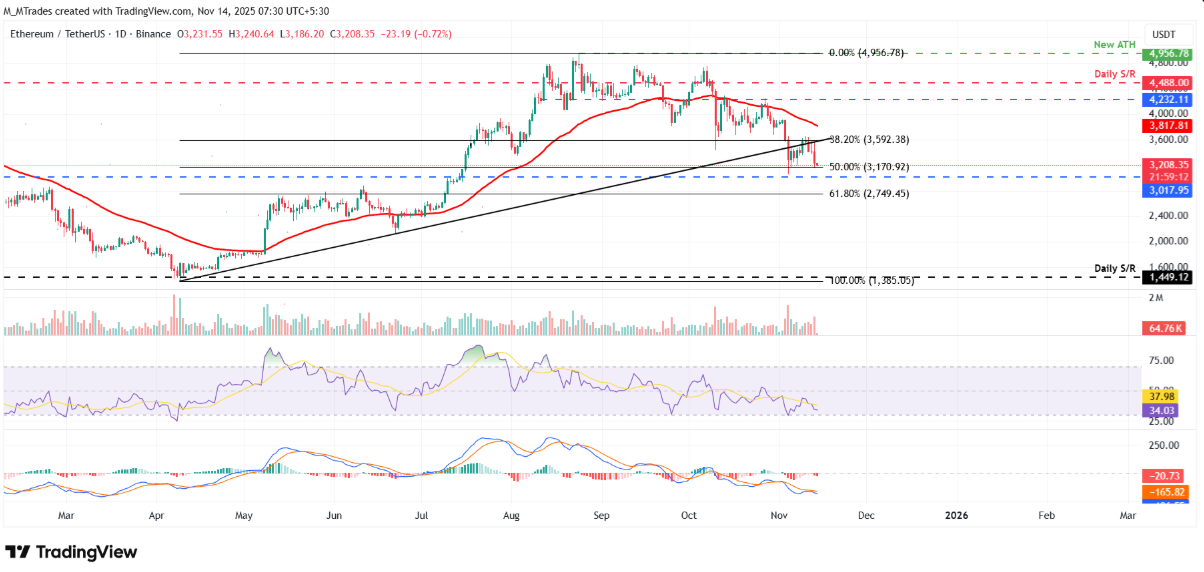 Giá Ethereum đã bị từ chối tại đường hỗ trợ từng bị phá vỡ trước đó quanh mốc 3.592 USD vào đầu tuần, trước khi lao dốc gần 10% trong ba ngày kế tiếp. Đến chiều thứ Sáu, ETH đang dao động quanh vùng 3.200 USD.