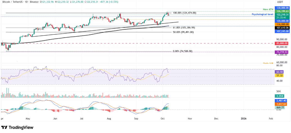 Bitcoin đã lập đỉnh lịch sử mới ở mức 126.199 USD vào ngày thứ Hai, sau khi tăng hơn 10% trong tuần trước. Tuy nhiên, đà hưng phấn nhanh chóng hạ nhiệt khi BTC quay đầu điều chỉnh 2,67% vào thứ Ba. Tính đến chiều thứ Tư, giá đồng coin này đang dao động quanh mốc 121.000 USD.