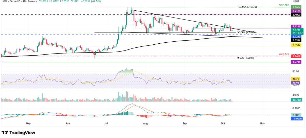 Giá XRP đã phá vỡ mô hình nêm giảm — hình thành từ chuỗi các đỉnh và đáy nối tiếp nhau kể từ giữa tháng 7 — vào thứ Năm tuần trước. Sau cú bứt phá này, đồng coin đã quay lại kiểm tra biên trên của mô hình và giữ vững hỗ trợ trong ba ngày liên tiếp. Tuy nhiên, đến thứ Ba, XRP bất ngờ giảm gần 5%, đóng cửa dưới vùng hỗ trợ quan trọng. Tính đến thời điểm viết bài hôm thứ Tư, XRP đang dao động quanh mốc 2,87 USD.
