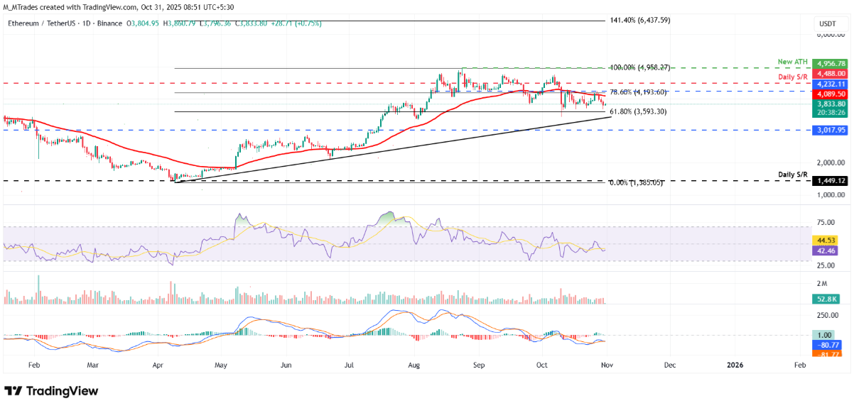Ethereum (ETH) gặp áp lực giảm mạnh khi bị từ chối tại vùng kháng cự 4.232 USD vào thứ Hai, và tính đến thứ Năm, đồng coin này đã giảm 8,86%, hiện đang giao dịch quanh mức 3.833 USD.