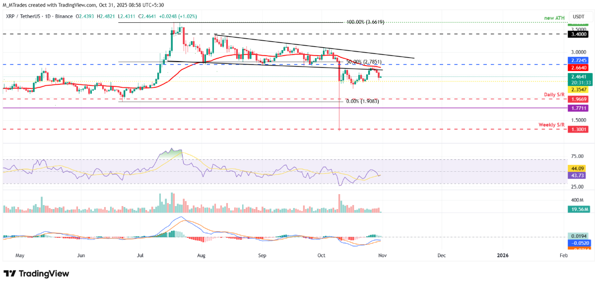 Vào thứ Hai, giá XRP gặp kháng cự mạnh tại đường EMA 50 ngày ở mức 2,66 USD và sau đó lao dốc gần 8% tính đến thứ Năm, quay trở lại kiểm tra vùng hỗ trợ quan trọng quanh 2,35 USD. Tối thứ Sáu, đồng coin này dao động quanh mốc 2,46 USD.