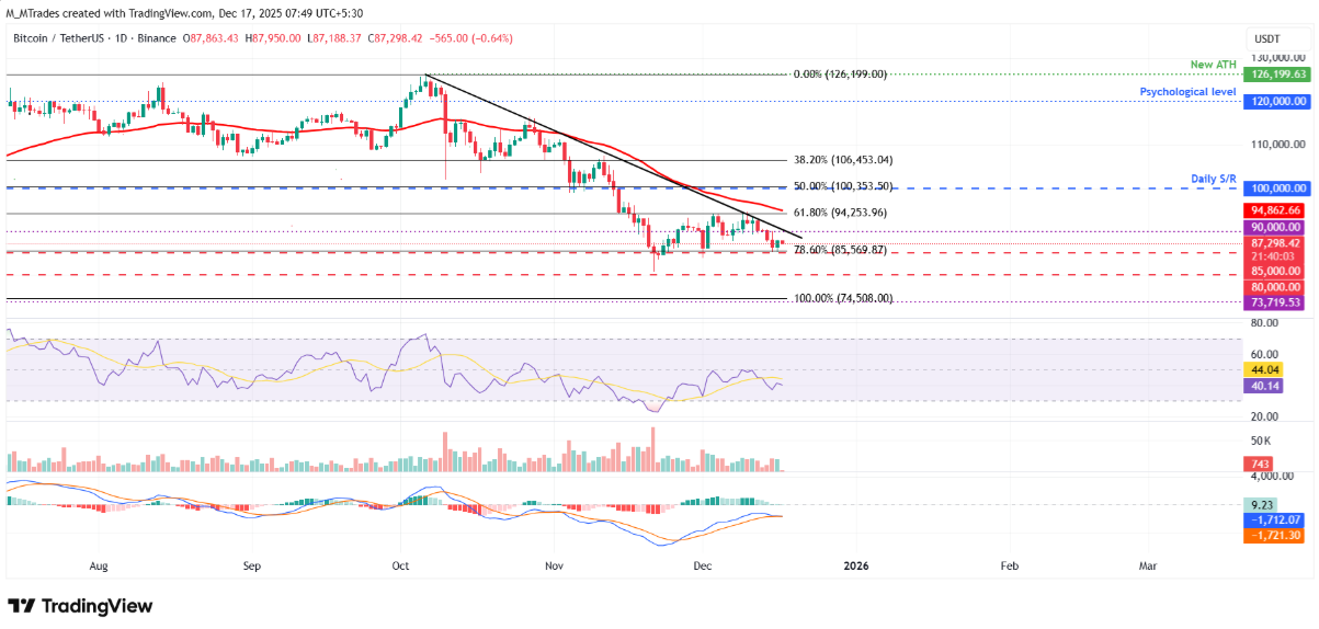 Giá Bitcoin đã vấp phải lực cản mạnh tại đường xu hướng giảm — được hình thành bằng cách nối các đỉnh kể từ đầu tháng 10 — trong phiên giao dịch ngày thứ Sáu, trước khi lao dốc gần 7% và quay trở lại kiểm tra vùng hỗ trợ quan trọng tại 85.569 USD vào thứ Hai. Dù vậy, lực mua đã xuất hiện tại khu vực này, giúp BTC bật tăng nhẹ trong phiên thứ Ba. Tính đến thời điểm viết bài vào thứ Tư, Bitcoin đang dao động quanh mốc 87.300 USD.