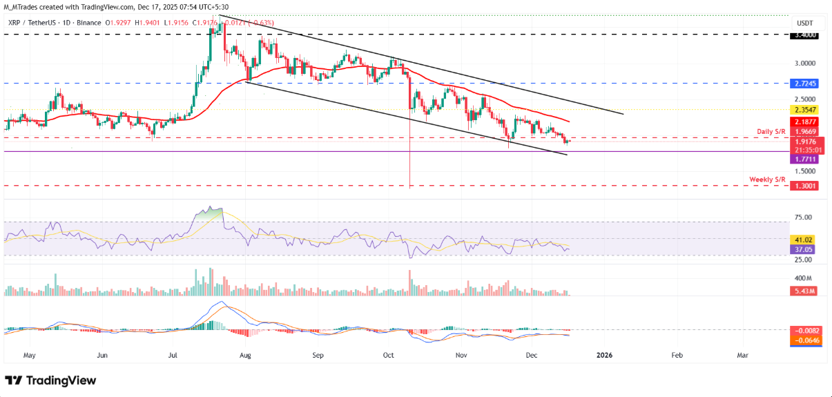 Trong kịch bản tiêu cực, nếu nhịp điều chỉnh chưa kết thúc, đà giảm của XRP có thể mở rộng về vùng hỗ trợ ngày kế tiếp tại 1,77 USD.