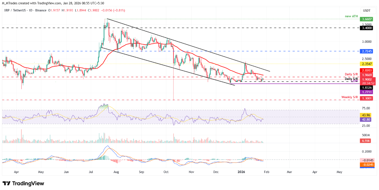 Giá XRP đã kiểm tra lại và giữ vững vùng hỗ trợ 1,83 USD trên khung ngày vào Chủ nhật, trước khi bật tăng 4,51% trong hai ngày tiếp theo. Tính đến thời điểm viết bài vào thứ Tư, đồng coin này đang giao dịch quanh mức 1,90 USD.