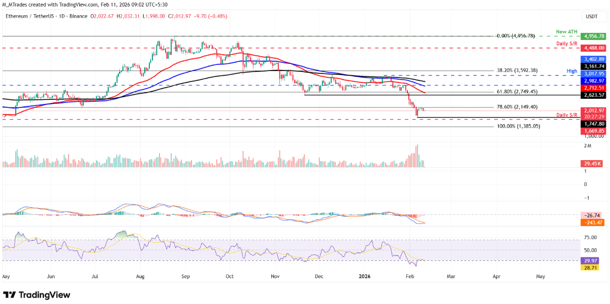 Ethereum đã nỗ lực kiểm tra nhưng không thể vượt qua ngưỡng Fibonacci thoái lui 78,6% tại 2.149 USD vào ngày thứ Hai, trước khi quay đầu suy yếu và mất gần 4% trong phiên kế tiếp. Tính đến thời điểm viết bài vào thứ Tư, ETH đang dao động quanh mốc 2.012 USD.