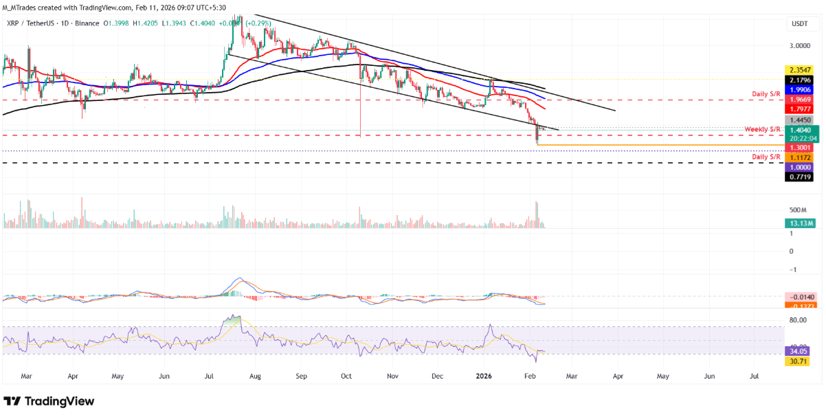XRP đã quay lại kiểm tra đường xu hướng vừa bị phá vỡ của mô hình cái nêm giảm vào ngày thứ Sáu, tuy nhiên lực bán liên tục áp đảo khiến giá nhiều lần bị từ chối quanh khu vực này cho đến hết ngày thứ Ba. Bước sang thứ Tư, XRP vẫn đang giao dịch dưới ngưỡng 1,40 USD, cho thấy áp lực giảm giá chưa hề suy yếu.