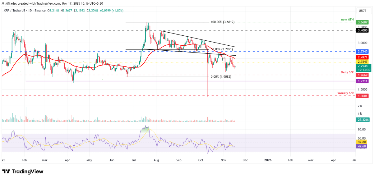 Tuần trước, XRP đã chịu áp lực bán mạnh quanh đường EMA 50 ngày tại mức $2,49, khiến giá lao dốc gần 7%. Đến thời điểm viết bài vào thứ Hai, đồng coin này đang giao dịch quanh mức $2,25.