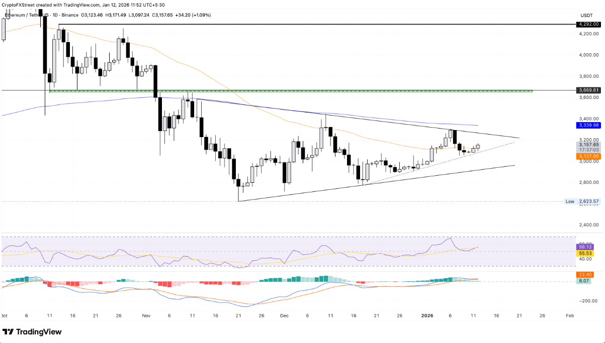 Đà tăng hiện tại đang đưa ETH tiến sát đường kháng cự phía trên, nối các đỉnh ngày 12/11 và 10/12, quanh khu vực 3.260 USD. Hai đường xu hướng hội tụ này tạo nên mô hình tam giác cân trên khung thời gian ngày — một cấu trúc thường báo hiệu giai đoạn tích lũy trước khi giá bứt phá theo xu hướng mới.