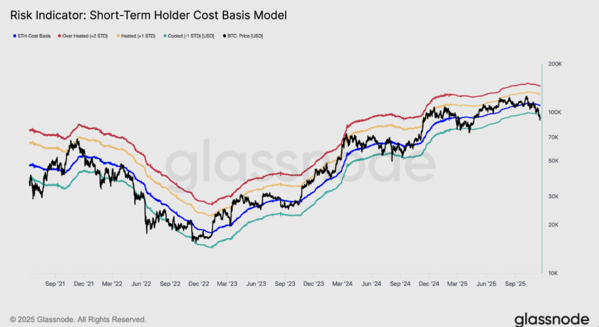 Báo cáo tuần qua của Glassnode, công bố hôm thứ Tư, cho thấy một sự dịch chuyển rõ rệt trong cấu trúc thị trường Bitcoin sau khi giá phá vỡ dứt khoát mốc 97.000 USD. Cú thủng này nhanh chóng kéo BTC lao xuống 89.000 USD, hình thành mức đáy mới dưới dải độ lệch chuẩn (95.400 USD) so với chi phí vốn của nhóm nắm giữ ngắn hạn (STH), vốn đang nằm quanh 109.500 USD như biểu đồ thể hiện.